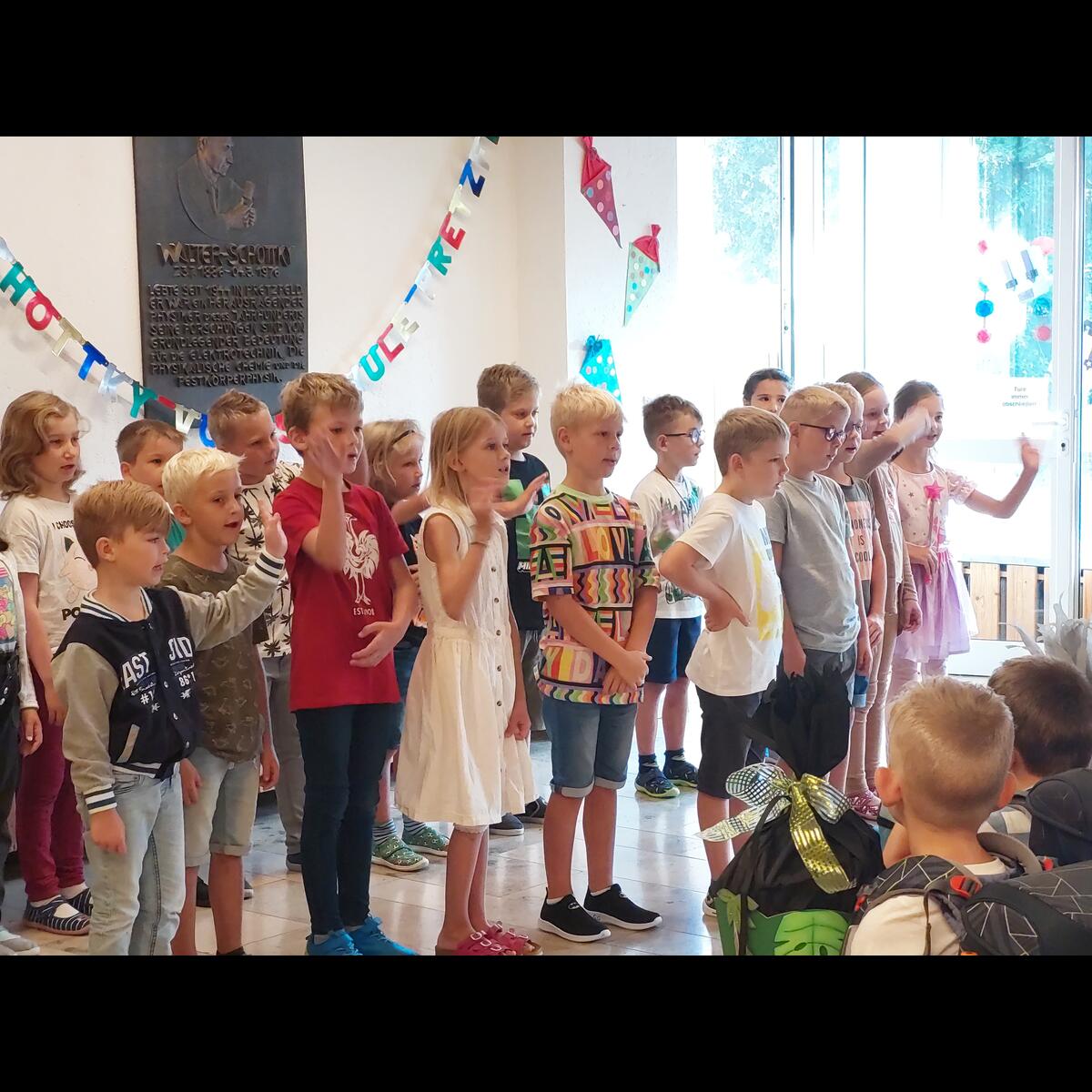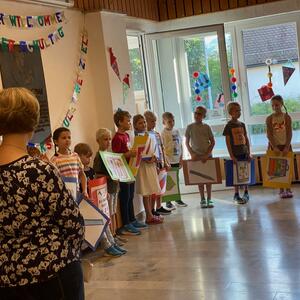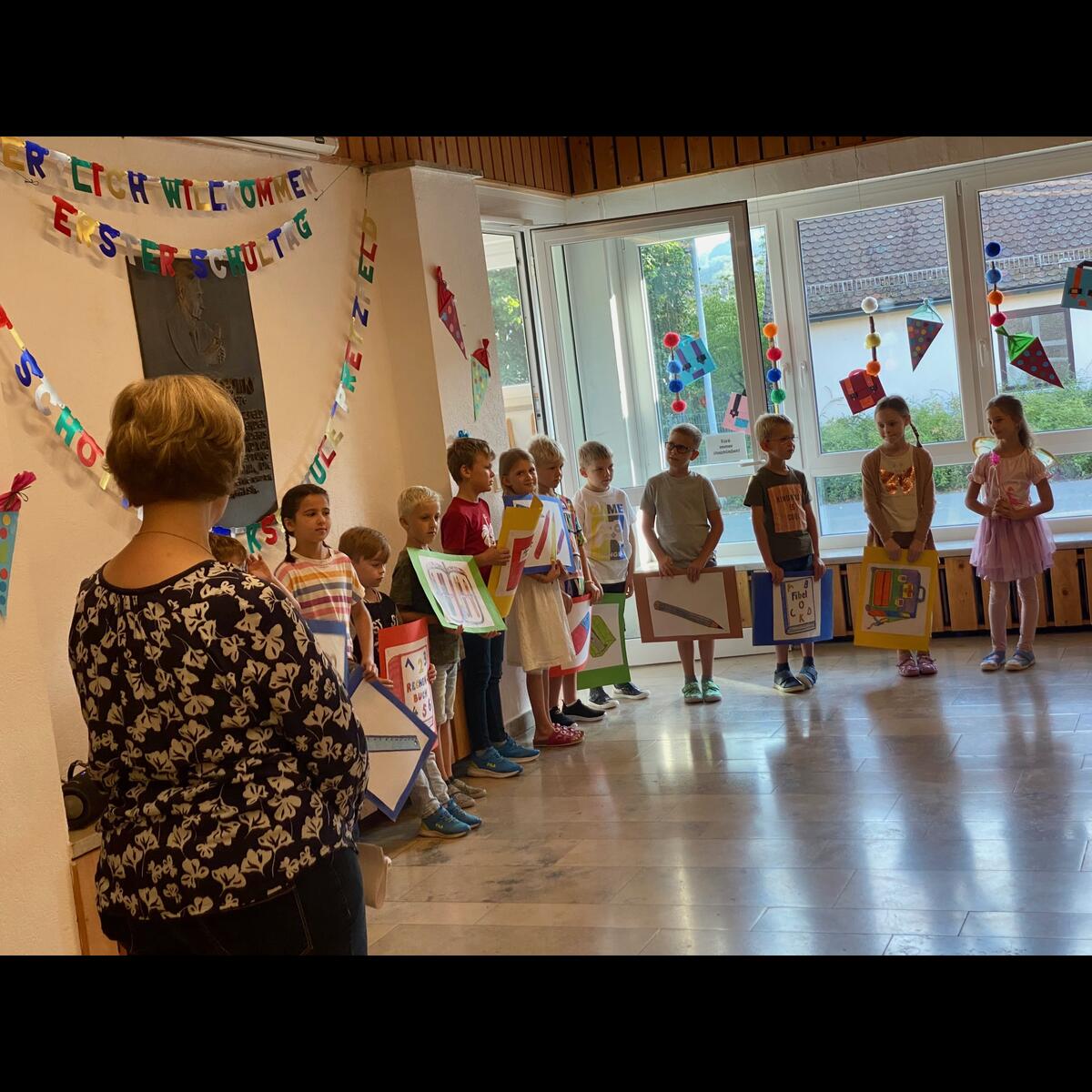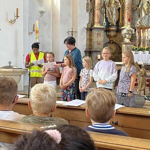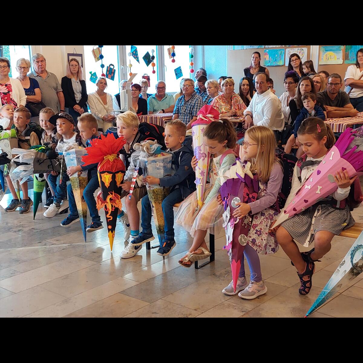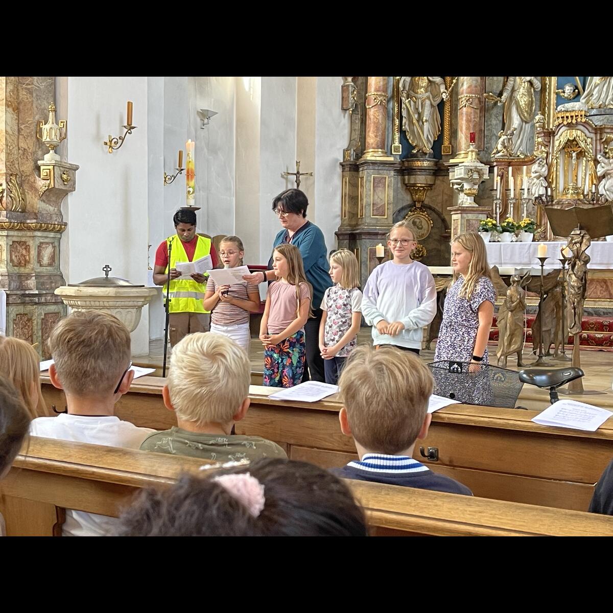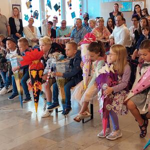 Besonders aufgeregt waren natürlich unsere Erstklässler, die mit ihren Eltern zur Begrüßung in die Aula gekommen waren. Dort begrüßte die 2. Klasse alle mit ihrem Lied "Herzlich willkommen, ihr lieben Leute" und hatte auch ein kleines Theaterstück vorbereitet. In dem Stück "Streit der Schulsachen" erlebten die Schulanfänger, warum sich jedes der Schulsachen für das Wichtigste hielt. Die ABC-Fee beendete schließlich den Streit mit den Worten "Hört auf zu streiten, ihr seid alle gleich wichtig" und schickte die Schulsachen in den Schulranzen. Hier waren die Eltern noch mit dabei, danach ging es für die ABC-Schützen ohne Eltern, aber mit einer großen Schultüte im Arm ab in ihr Klassenzimmer. Mit einem gemeinsamen ökumenischen Gottesdienst, den alle Klassen mit Gemeindereferentin Maria Sponsel, Pfarrer Sam Kost und Pater Daniel feiern konnten, endet der 1. Schultag für die Schulanfänger und deren Eltern in der Pretzfelder Kirche.
