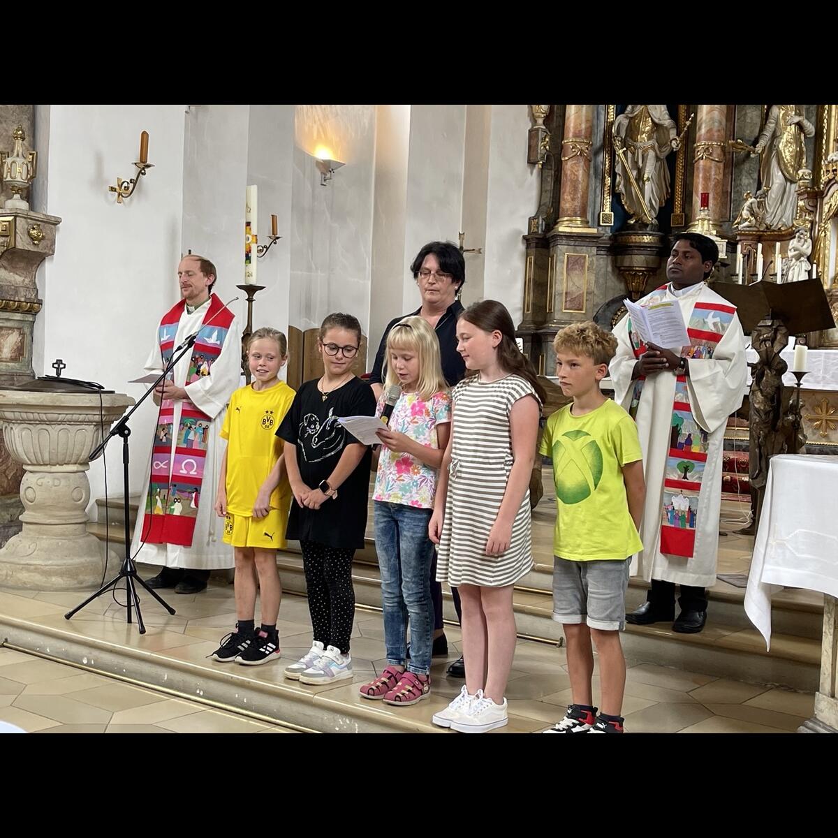 Mit zahlreichen Fotos ließen ihre Lehrerinnen Frau Forster-Sennefelder und Frau Lohneis die vier Jahre Grundschulzeit noch einmal Revue passieren. Die Viertklässler erinnerten mit originellen Gedichten an viele schöne Erlebnisse in den vergangenen Jahren und erhielten dafür viel Applaus. Zum Abschluss der Feier erhielten alle Schüler noch ein Eis, gesponsert vom Förderverein. Mit einem gemeinsamen Gottesdienst in der Pretzfelder Kirche, den Pfarrer Sam Kost, Gemeindereferentin Maria Sponsel und Pater Daniel gestalteten, endete das Schuljahr 2023/24. Allen Schülerinnen und Schülern und ihren Familien wünschen wir erholsame und erlebnisreiche Ferien und freuen uns auf ein gesundes Wiedersehen am 10. September. Unseren Viertklässlern wünschen wir alles Gute im weiteren Leben, verbunden mit dem Wunsch, dass sie die Grundschule Pretzfeld immer in guter Erinnerung behalten werden.